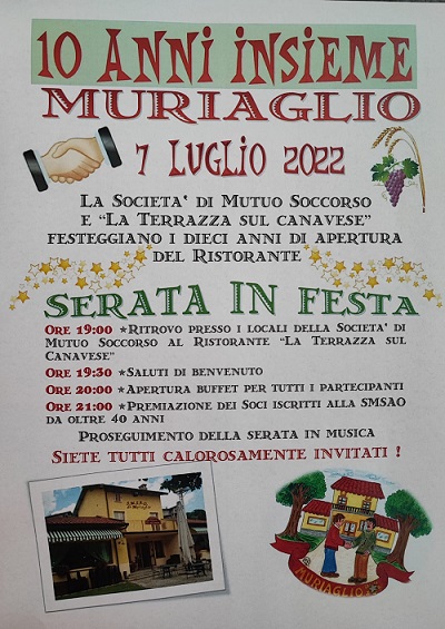 E infine, giovedì 7 luglio, spazio al connubio tra festa, enogastronomia locale e musica con la “Serata in festa” che avrà luogo presso il ristorante “La Terrazza sul Canavese”. L’evento, denominato “10 anni insieme” avrò luogo in frazione Muriaglio, è promosso dalla Società di Mutuo Soccorso in occasione dei dieci anni di apertura del locale. Questo il programma: alle ore 19,00 è previsto il ritrovo presso i locali della Società di Mutuo Soccorso al ristorante “La Terrazza sul Canavese”. Seguiranno alle 19,30 i saluti di benvenuto ai convenuti, alle 20,00 l’apertura del buffet per tutti i partecipanti e alle ore 21,00 avrà luogo la premiazione dei soci iscritti alla SMSAO da oltre 40 anni. Proseguimento della serata in musica.