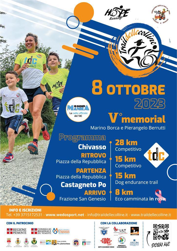 Cresce l’attesa per lo svolgimento della quinta edizione del Trail delle Colline 2023 organizzata come da tradizione dall’APS Hope Running Onlus e dall’Associazione Amici dei Vigili del Fuoco Volontari di Chivasso. Svelate le magliette ufficiali e le medaglie di finisher, non resta che attendere la giornata di domenica 8 ottobre per conoscere tutte le altre novità di questo evento sportivo inclusivo e solidale che ogni anno richiama centinaia di persone a Chivasso e Castagneto Po. Il Comitato Organizzatore e i volontari sono all’opera in questi giorni per limare gli ultimi dettagli e preparare i pacchi gara che verranno distribuiti nei giorni precedenti il TdC, chi intende ancora iscriversi deve affrettarsi per avere il suo pettorale, ma non solo: tutto il territorio è pronto ad ospitare il primo trail nel cuore verde delle colline chivassesi e nei sentieri naturalistici di Castagneto Po.
