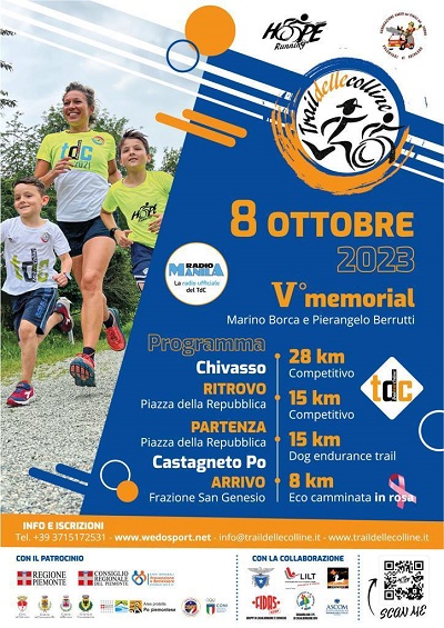 Confermate le collaborazioni e partnership, come quelle con Csen Piemonte, ente di promozione sportiva che ha inserito anche quest’anno il Trail delle Colline nel suo calendario nazionale, con Fudas Adsp, Turismo Torino e Provincia, sezione di Chivasso del Cai, Comitato chivassese della Croce Rossa Italiana, Squadra Aib e PC di Casalborgone Odv e Associazione Amici del Po di Chivasso, e dei patrocini, come quello della Regione Piemonte, del Consiglio Regionale del Piemonte e degli Stati generali Prevenzione e Benessere, dell’Ente di gestione delle Aree protette del Po piemontese e del Comitato Regionale CONI del Piemonte.