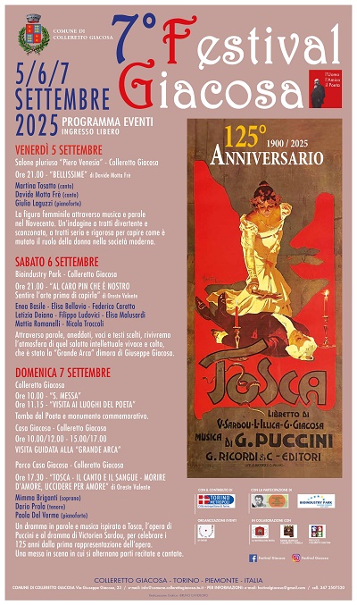 Il gran finale è previsto domenica 7 settembre: in mattinata, come da tradizione, l’omaggio ai luoghi giacosiani di Colleretto; nel pomeriggio, apertura straordinaria della “Grande Arca”, la dimora del poeta, e spettacolo in prima nazionale Tosca – Il canto e il sangue – Morire d’amore, uccidere per amore. Una produzione dell’Associazione lirica “Mario Del Monaco”, con la regia e la drammaturgia di Oreste Valente. In scena un soprano, un tenore, un attore e una pianista porteranno al pubblico una rilettura originale dell’opera, dando voce soprattutto alla dimensione interiore di Tosca, personaggio uscito dal cuore e dalla penna di Giuseppe Giacosa.
