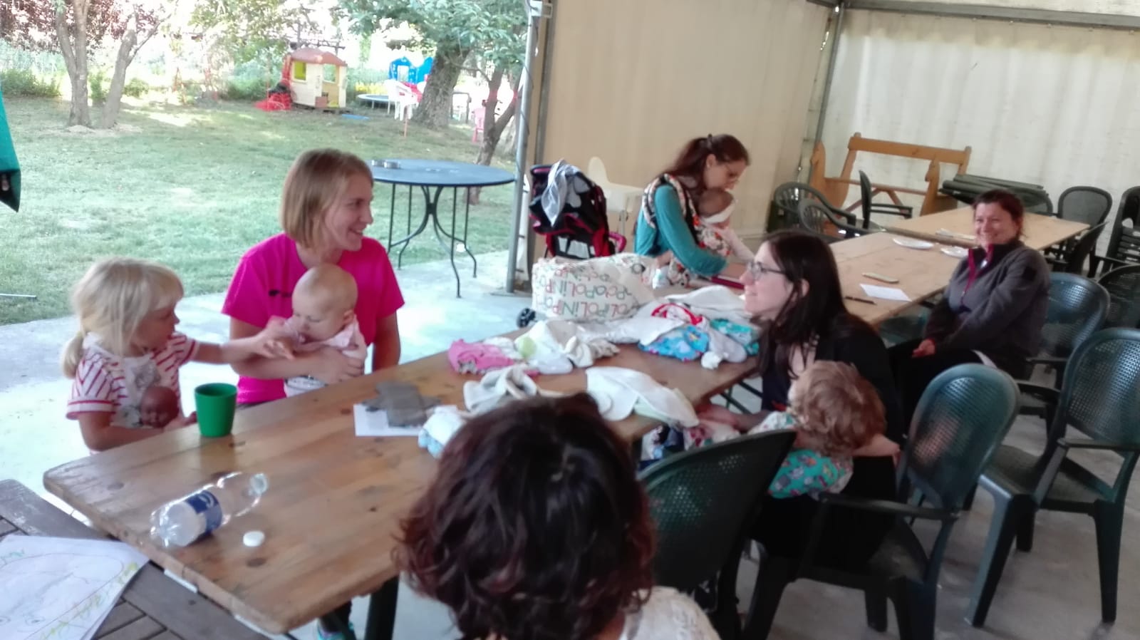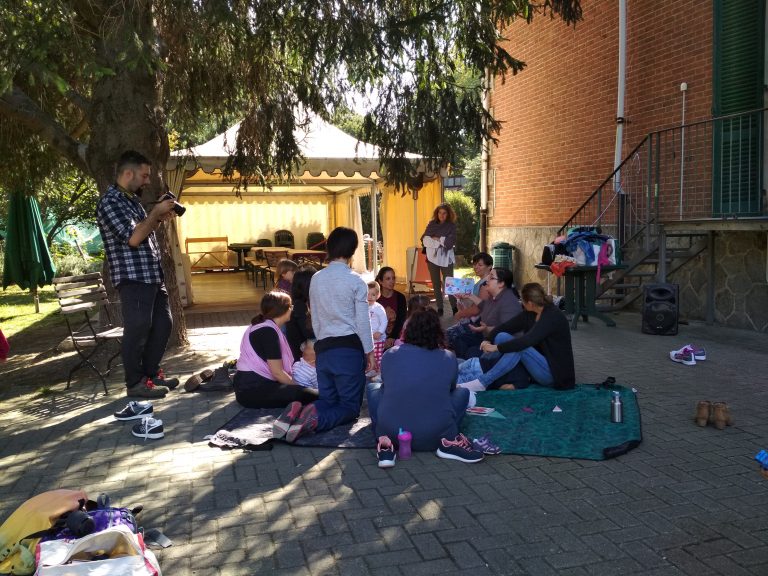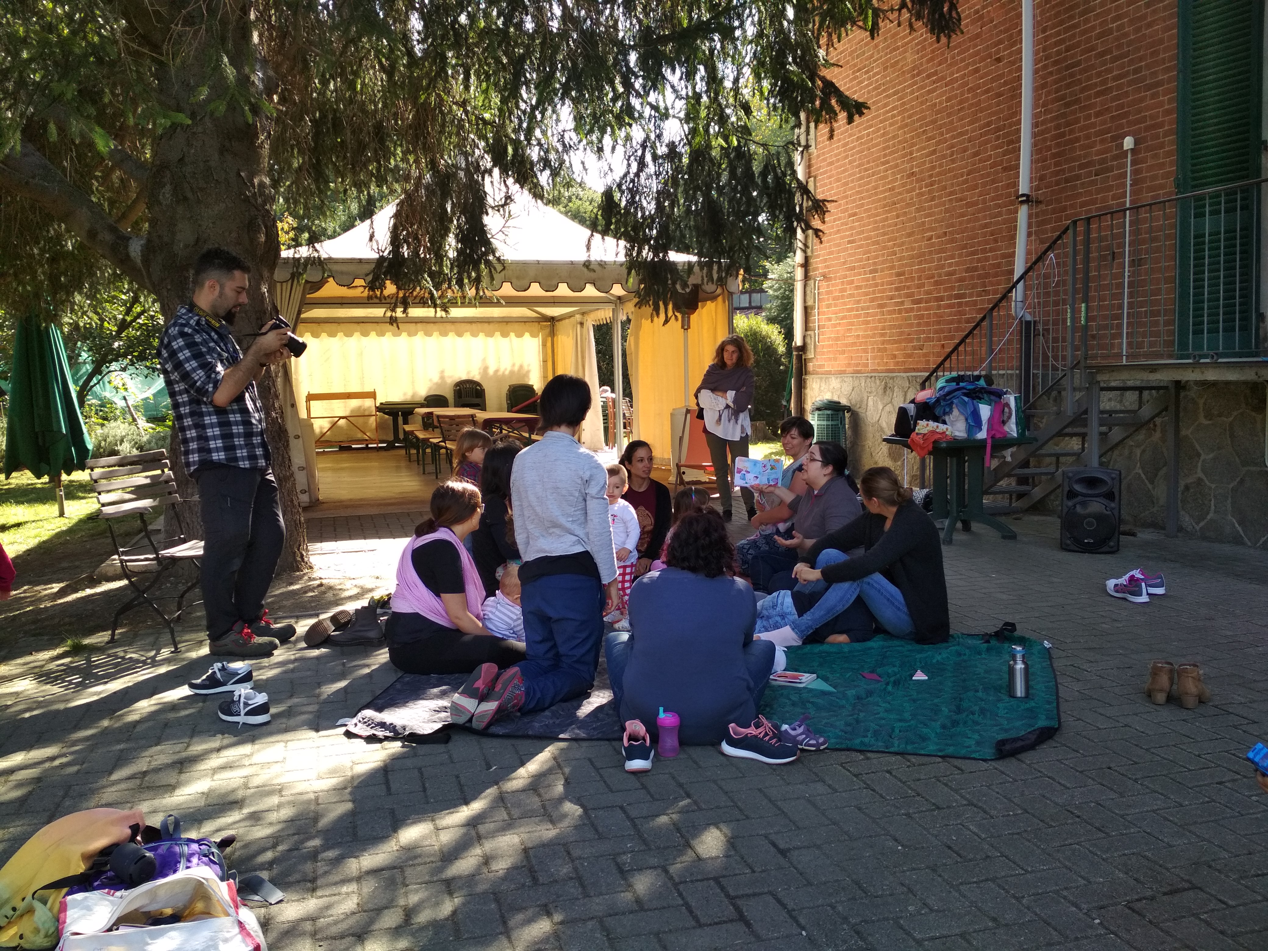 Al momento del pranzo una parte del gruppo di cammino si è riunito al gruppo mom’s per condividere il momento del pasto, grazie all’ottima cucina di Villa Filanda, e sono nate nuove idee di collaborazione e sinergia. Nel primo pomeriggio la Consulente della scuola del Portare Nicoletta Alossa, è stata a disposizione delle mamme nell’info poit sul babywearing, dove chiedere informazioni e suggerimenti per portare i bambini in fascia e marsupio. A seguire l’instancabile Valeria Ardissone “Aria LB” ha svolto un laboratorio per i più piccoli con un lavoro ispirato all’arteterapia , attraverso la lettura del libro “magie di latte” di Giorgia Cozza , che sarà ospite mom’s a Villa Filanda il prossimo 9 novembre. Nel mentre la mamma alla pari Gloria Birolo ha illustrato l’uso ed i vari modelli dei pannolini lavabili. In chiusura un cerchio di mamme accompagnate dalle mamme alla pari in allattamento Paola Orso Giacone, Sara Rej, Viviana Rosselli e Laura Giovando, hanno condiviso i pensieri della giornata e le emozioni del percorso della maternità.