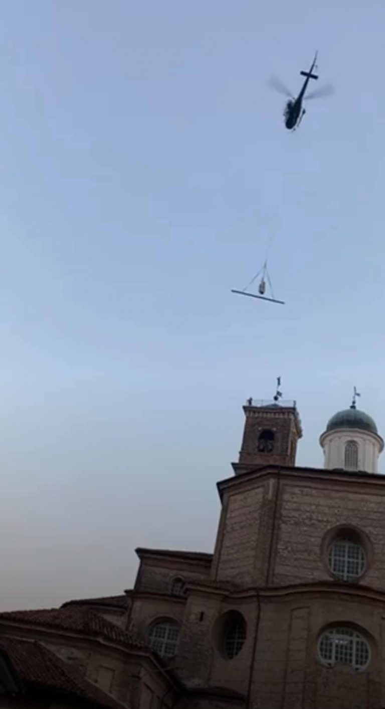 Favria: iniziati, con il supporto di un elicottero, i lavori di restauro del campanile della chiesa