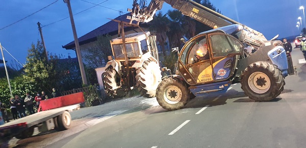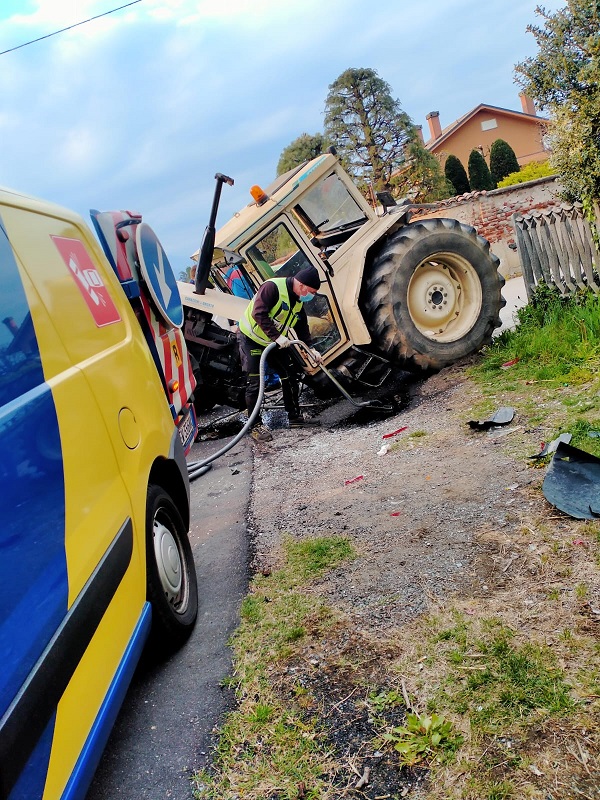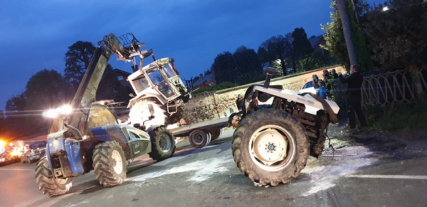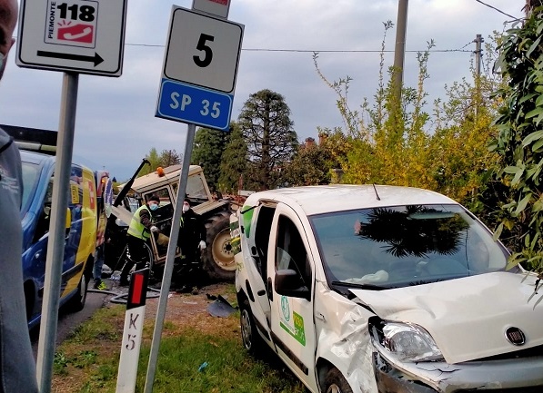 Favria: spettacolare incidente. Un trattore agricolo si spezza nell’urto con un furgone. Un ferito