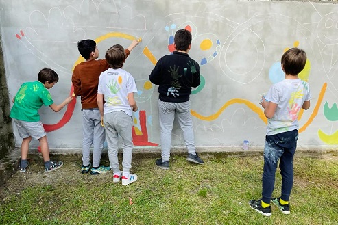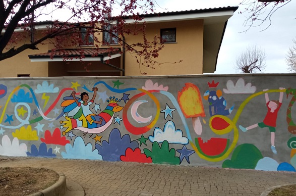Nella prima tappa del progetto, a fine marzo presso il parco giochi “Iqbal Masih” di via Uligini, le quinte A-B-C-D di scuola primaria “Elisabetta Gibellini Vallauri” e i partecipanti degli incontri pomeridiani del centro famiglie “Facciamo Centro” di Rivarolo hanno realizzato un dipinto murale e alcuni interventi artistici sulla pavimentazione. L’illustratrice Elena Mirandola, con esperienza in laboratori per l’infanzia e reduce dal nuovo murale per Ivrea Capitale del Libro presso il Movicentro, ha coordinato l’attività insieme agli educatori della società cooperativa Andirivieni e agli attori dell’associazione di promozione sociale Pandorama, già organizzatrice dell’Alfred Clown Festival di Bosconero.