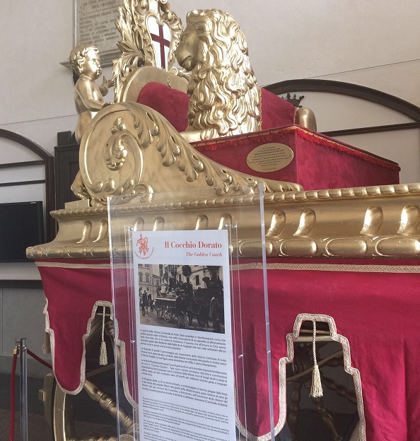 Il cocchio dorato, certamente uno dei simboli del Carnevale più cari agli eporediesi, torna a far bella mostra di sé nell’androne del Municipio. Alla chiusura del Carnevale il cocchio è stato, infatti, affidato alle cure di abili artigiani che, sotto la guida del mastro Eugenio Zanlorenzi, lo hanno riportato all’originario splendore.