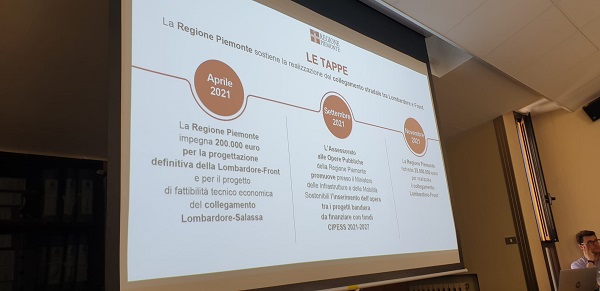 A dicembre 2019 la Regione Piemonte aveva chiesto alle Province di segnalare gli interventi più urgenti e la Città metropolitana di Torino aveva proposto tra le opere il collegamento Lombardore-Front. Tra il 2019 e il 2021 il Presidente della Regione Piemonte e l’Assessore alle Opere Pubbliche avevano sottoposto l’intervento ai ministri alle Infrastrutture che si sono succeduti negli anni. A settembre 2021 hanno inoltre promosso presso il Ministero delle Infrastrutture e delle Mobilità Sostenibili l’inserimento dell’opera tra i progetti bandiera da finanziare con fondi Cipess 2021-2027. Richiesta che viene accolta a febbraio 2022 con l’assegnazione di 135 milioni a 4 opere infrastrutturali strategiche in Piemonte da parte del Cipess, di cui 25 milioni sono destinati alla Lombardore-Front.