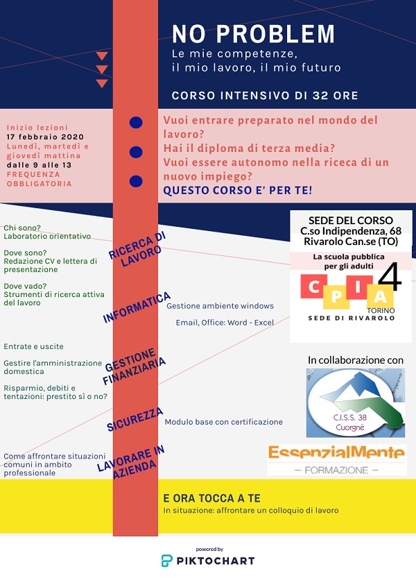 Partirà il 2 marzo a Rivarolo il nuovo corso organizzato dal CPIA TO4 “No problem: le mie competenze, il mio lavoro, il mio futuro”, corso di 32 ore che vede il coinvolgimento di tre Enti del territorio, CPIA TO4, Consorzio dei Servizi Sociali Ciss 38, ed EssenzialMente Formazione, insieme per aiutare le persone nella ricerca del lavoro e nell’arte di candidarsi alle offerte lavorative.