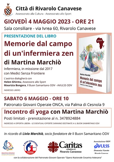 Giovedì 4 maggio alle ore 21,00 in Sala consiliare a Rivarolo Canavese – via Ivrea 60 – Martina Marchiò presenterà il libro “Memorie dal campo di un’infermiera zen” (Infinito edizioni, 2023). Rivarolese, laureata in Scienze infermieristiche, dopo una prima esperienza nel 2014 in Africa, dal 2017 Martina partecipa alle missioni di Medici Senza Frontiere. All’esperienza professionale si aggiunge la ricerca come insegnante di yoga e meditazione, attivista e storyteller, sviluppata sul blog www.infermierazen.com