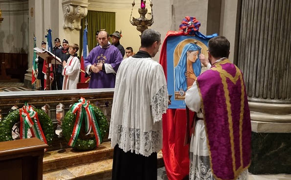 La prima edizione della celebrazione in onore della “Virgo Fidelis”, patrona dell’Arma, svoltasi sotto la presidenza del luogotenente in congedo Ignazio Mammino, da poco alla guida dell’Associazione Nazionale Carabinieri, ha registrato un successo degno di nota. La manifestazione ha avuto luogo a Rivarolo Canavese e a Favria nel tardo pomeriggio e nella serata di ieri, sabato 3 dicembre, con la messa celebrata nella chiesa parrocchiale di San Michele Arcangelo officiata dal parroco don Raffaele Roffino, al termine della quale, dopo la benedizione delle corone di alloro, ha fatto seguito la commovente lettura della “preghiera del carabiniere”.