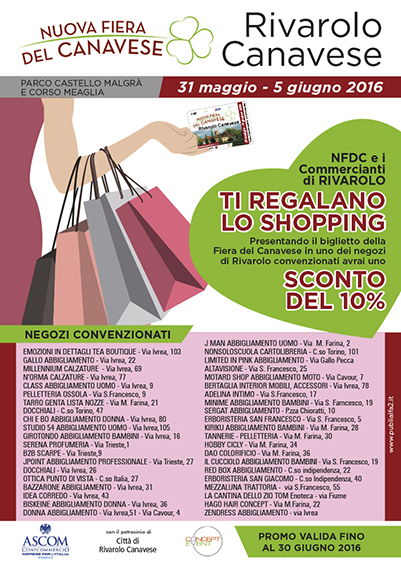 Tutti coloro che presenteranno il biglietto d’ingresso della Nuova Fiera del Canavese potranno usufruire di uno speciale sconto del 10% sui prodotti acquistati negli esercizi commerciali di Rivarolo convenzionati con la Nuova Fiera del Canavese, simbolo della rinascita della grande eccellenza territoriale, dell’impegno e del talento dei suoi imprenditori.