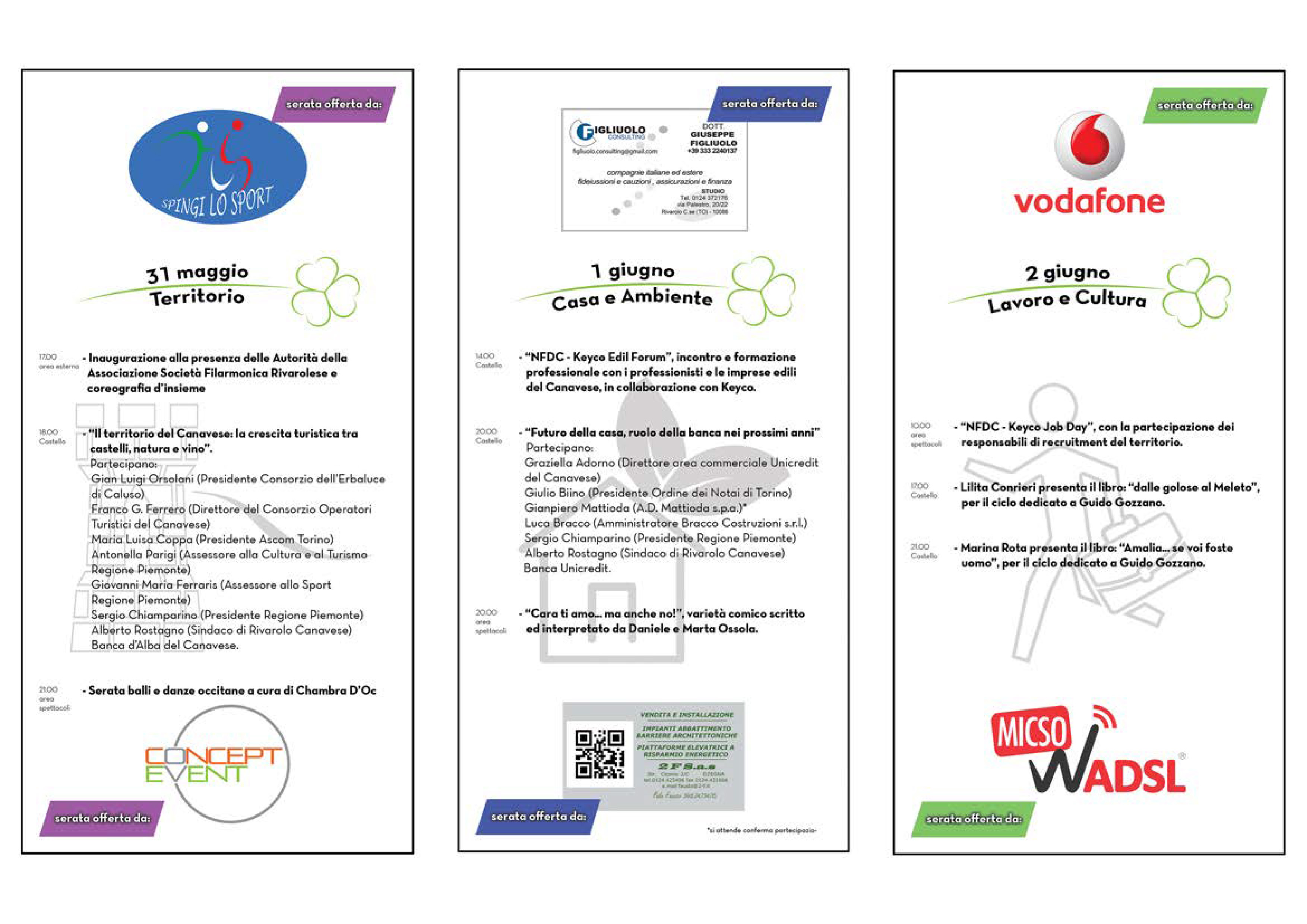 Ma la Fiera non sarà solo una manifestazione espositiva. Rivarolo vivrà giorni intensi grazie al ricco calendario di eventi collaterali, che faranno di questa rassegna anche un laboratorio di Idee con il coinvolgimento di personalità di primo piano, fra cui il presidente di Ascom Maria Luisa Coppa, il direttore del Parco Nazionale del Gran Paradiso Michele Ottino, il presidente del Consorzio dell’ Erbaluce Gian Luigi Orsolani, il presidente dell’Ordine dei notai torinesi Giulio Biino, il presidente di Confindustria Canavese Fabrizio Gea. In calendario tre incontri (31 maggio, 1 e 3 giugno) dedicati al ruolo delle banche nella crescita del territorio organizzati da Concept Event ed eventi organizzati dalla Keyco, società di consulenza aziendale, sui temi dell’ambiente, del territorio e del lavoro.