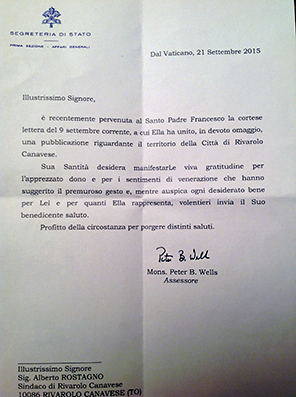 La lettera di ringraziamento di Papa Francesco reca la firma di monsignor Peter Brian Wells, Assessore per gli Affari Generali della Segreteria di Stato Vaticana ed è stata recapitata a Don Raffaele Roffino, Arciprete della parrocchia di San Giacomo Maggiore, con la richiesta che la missiva fosse consegnata personalmente nelle mani del sindaco di Rivarolo Alberto Rostagno.