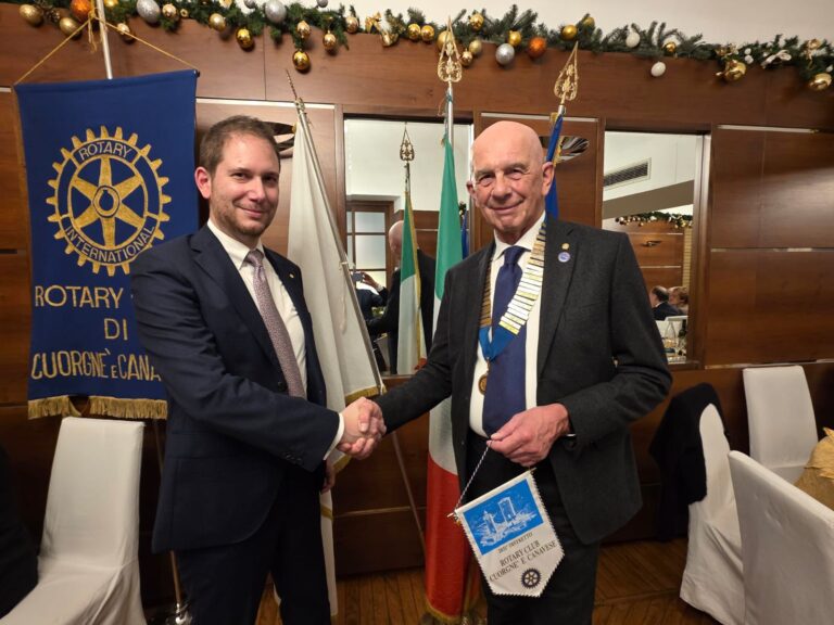 La serata è stata anche l’occasione per un momento particolarmente sentito all’interno della vita del Club: il presidente Bianchetta ha infatti appuntato la spilla con la ruota del Rotary al figlio Andrea, ufficialmente entrato a far parte del Rotary Club Cuorgnè e Canavese, accolto con l’applauso dei presenti.
