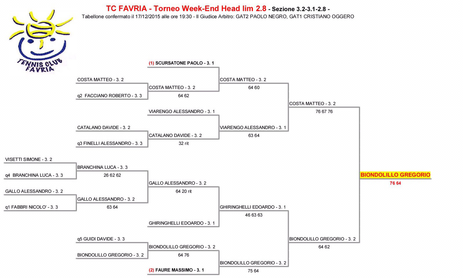 Gli organizzatori del Torneo ringraziano con calore ancora una volta tutti i partecipanti, giunti da Milano e da Aosta, da Cuneo e Torino e che si sono tutti distintisi per l’ottimo livello di gioco, ma soprattutto per la cortesia, la correttezza e la disponibilità dimostrata verso i propri amici-avversari e verso il TC Favria. Che il nuovo Anno sia per loro foriero di altre e ancora più brillanti affermazioni.