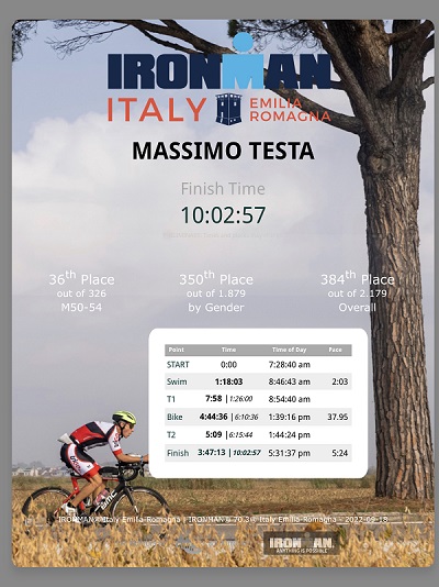 Di recente Massimo ha avviato anche un laboratorio di sartoria su misura, abiti confezionati a mano con tessuti pregiati, ma viene da pensare che abbia preparato con tenacia artigianale anche la sua preparazione sportiva all’evento nazionale in cui ha realizzato un ottimo tempo, sia nei 3 km 800 metri di nuoto, sia nella maratona, sia nel percorso in bicicletta lungo le strade della Romagna.