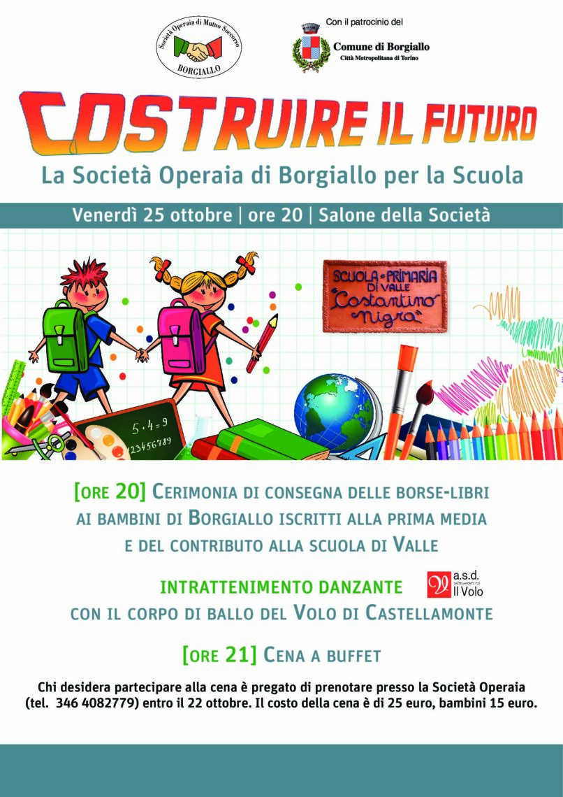 Sono cinque i bambini di Borgiallo che hanno lasciato la scuola elementare e hanno iniziato a frequentare la prima media. A ciascuno di loro la Società Operaia consegnerà venerdì 25 ottobre una “borsa libri” consistente in un assegno di 150 euro quale concreto contributo ad alleviare le consistenti spese sostenute dalle famiglie per l’acquisto dei libri necessari per il nuovo corso di studi.